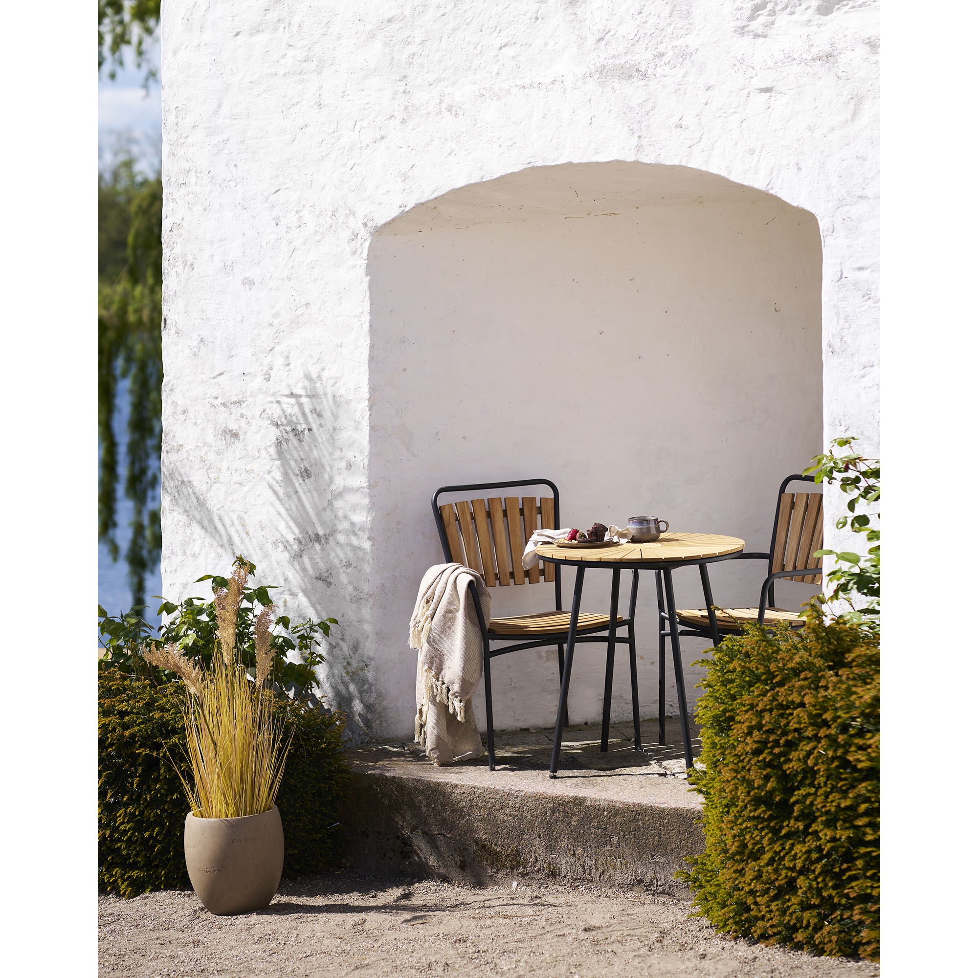 Café Table, teak table top, natural, black legs, ø70×74 cm