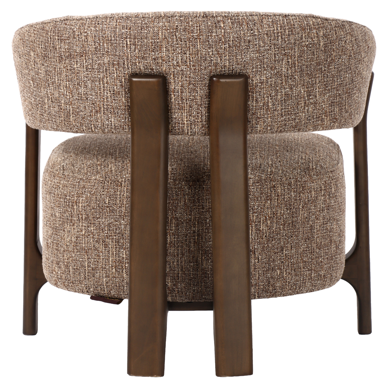 Fauteuil Dalara combineert een massief beukenhouten frame met een afgeronde rugleuning en compacte zitting. Bekleed met brown tweed-stof voor een warme en verfijnde uitstraling